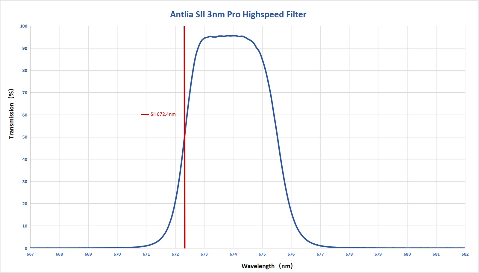 The Antlia Sii 3nm Pro Highspeed filters are specially optimised for fast telescopes with focal ratios between f/2.6 and f/3.6. By pre-shifting the center wavelength, these filters deliver significantly better signal-to-noise ratio (SNR) than the standard 3nm Pro series when used with high-speed imaging systems.