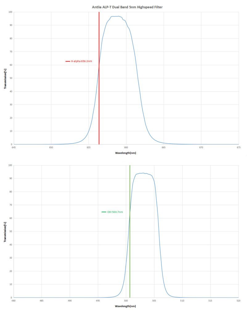 The ALP-T Dual Band 5nm filter uses a dual line-pass design that targets the H-alpha (656.3nm) and OIII (500.7nm) emission lines. It’s ideal for one-shot color (OSC) cameras, such as DSLRs and dedicated astronomy cameras, and also serves as a time-saving narrowband option for monochrome setups.