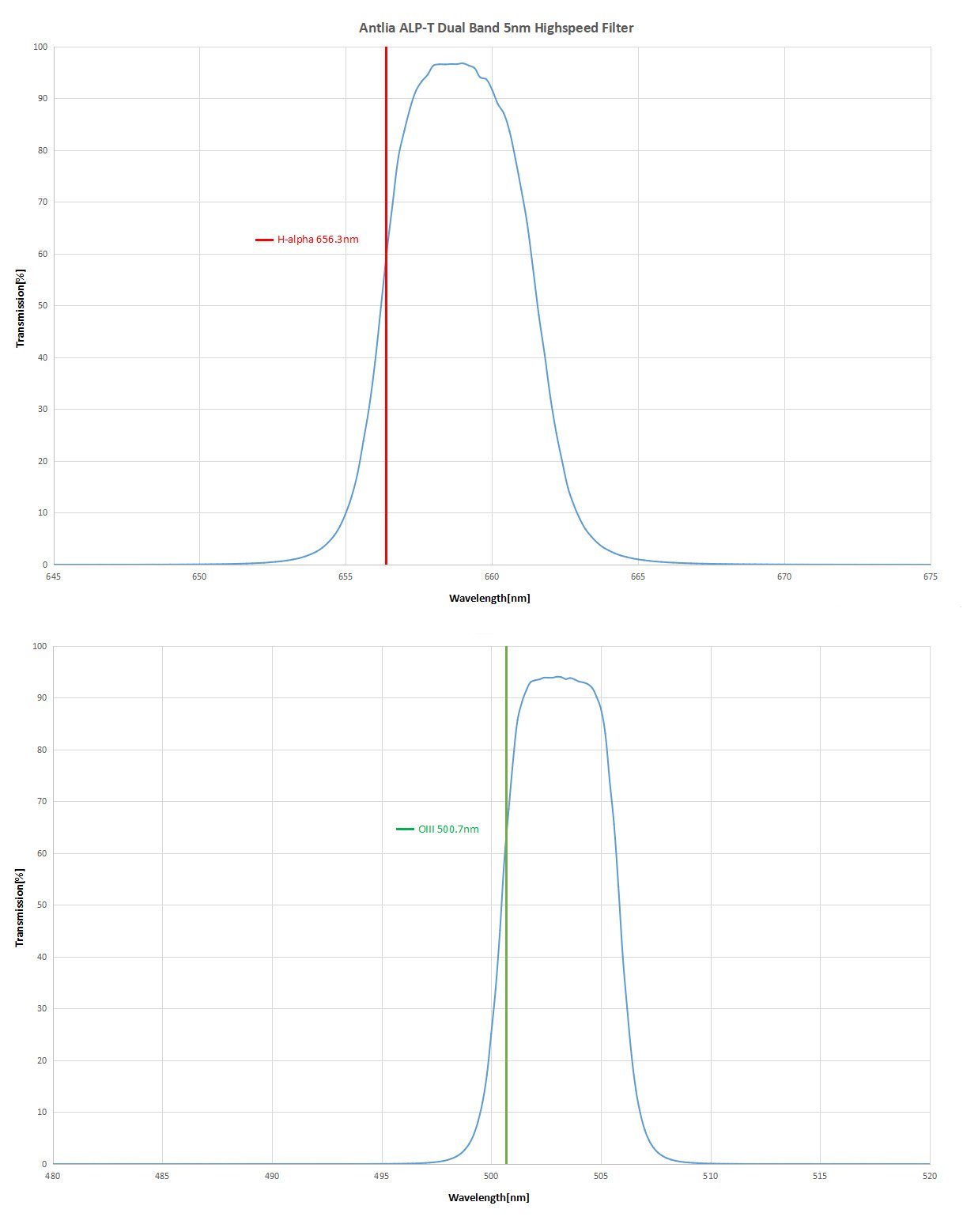 The ALP-T Dual Band 5nm filter uses a dual line-pass design that targets the H-alpha (656.3nm) and OIII (500.7nm) emission lines. It’s ideal for one-shot color (OSC) cameras, such as DSLRs and dedicated astronomy cameras, and also serves as a time-saving narrowband option for monochrome setups.