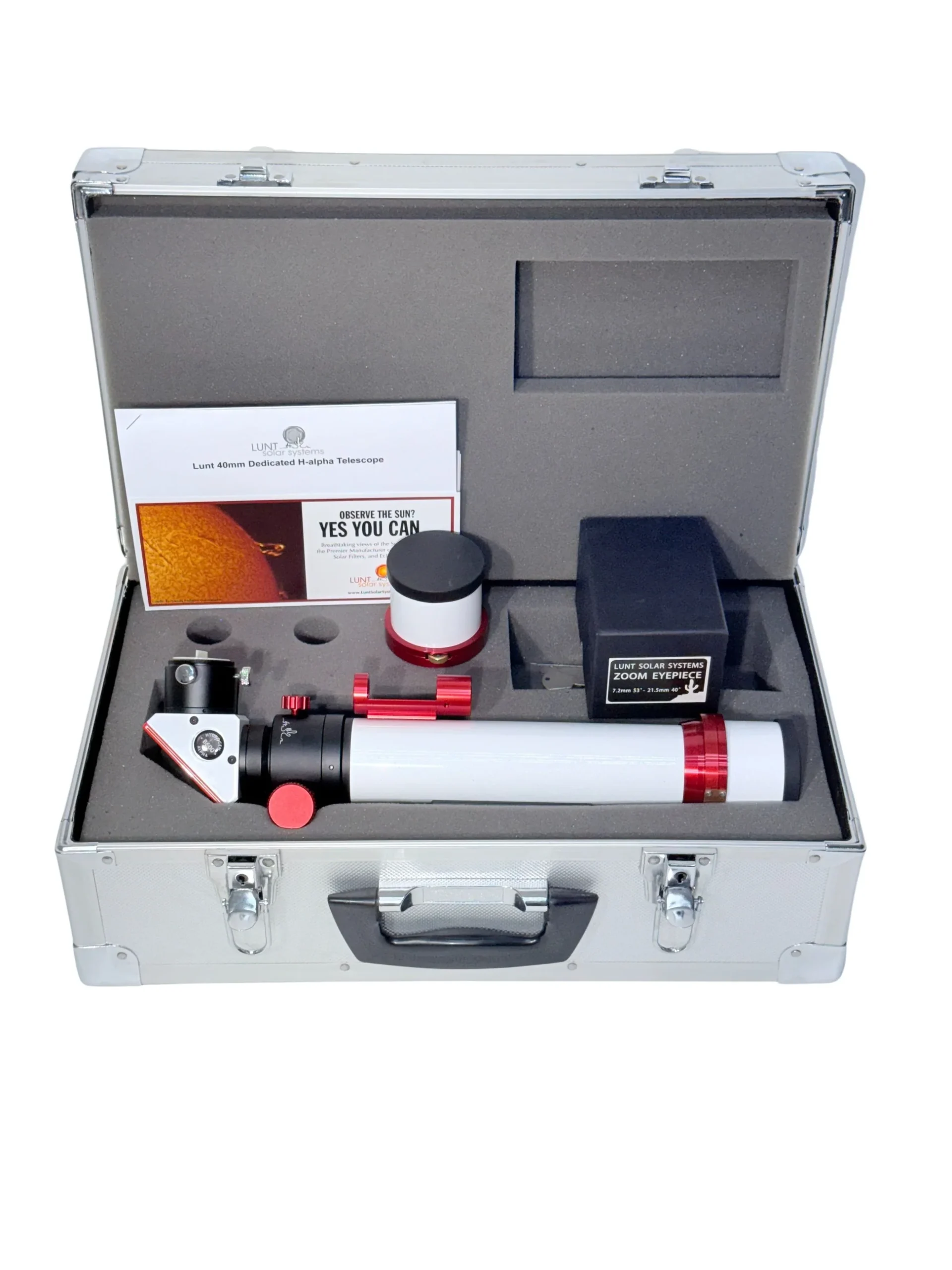 The LS40THa Double Stack Premium Kit delivers the narrowest bandpass available in Lunt’s 40mm system: sub-0.5Ã… performance that reveals chromospheric detail invisible at wider bandwidths. The front-mounted LS40FHa Double Stack filter adds a second independently-tuned etalon to the optical path, dramatically increasing surface contrast while preserving the full unobstructed aperture.