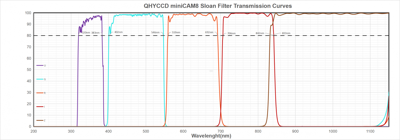 A set of photometric filters designed to fit the monochrome QHY MiniCam8. The five filters in the set follow the Sloan Digital Sky Survey system and are U’, G’, R’, I’ and Z’. The frequency response curves for the filters are below.
