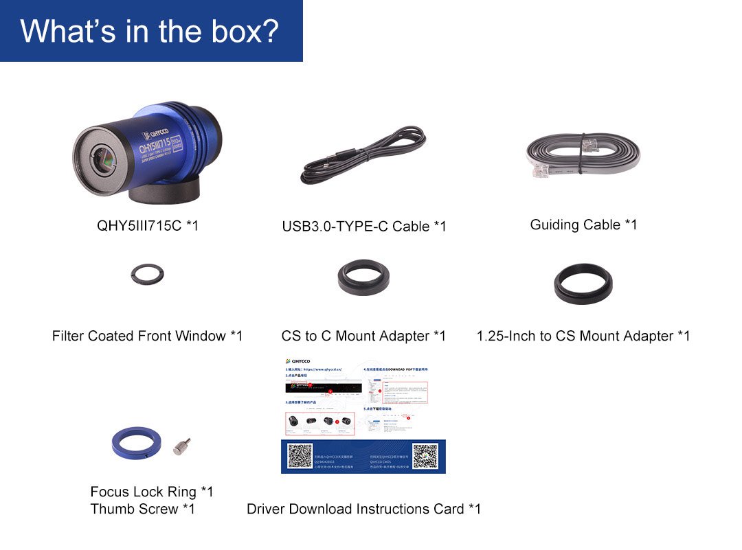 The QHY5III715C is an ultra-high resolution back-illuminated color camera with extremely low read noise. The sensor has a 1/2.8-inch optical format, 4K resolution with 1.45um pixels. This makes the new QHY5III715C ideal for smaller short focal length refractors.