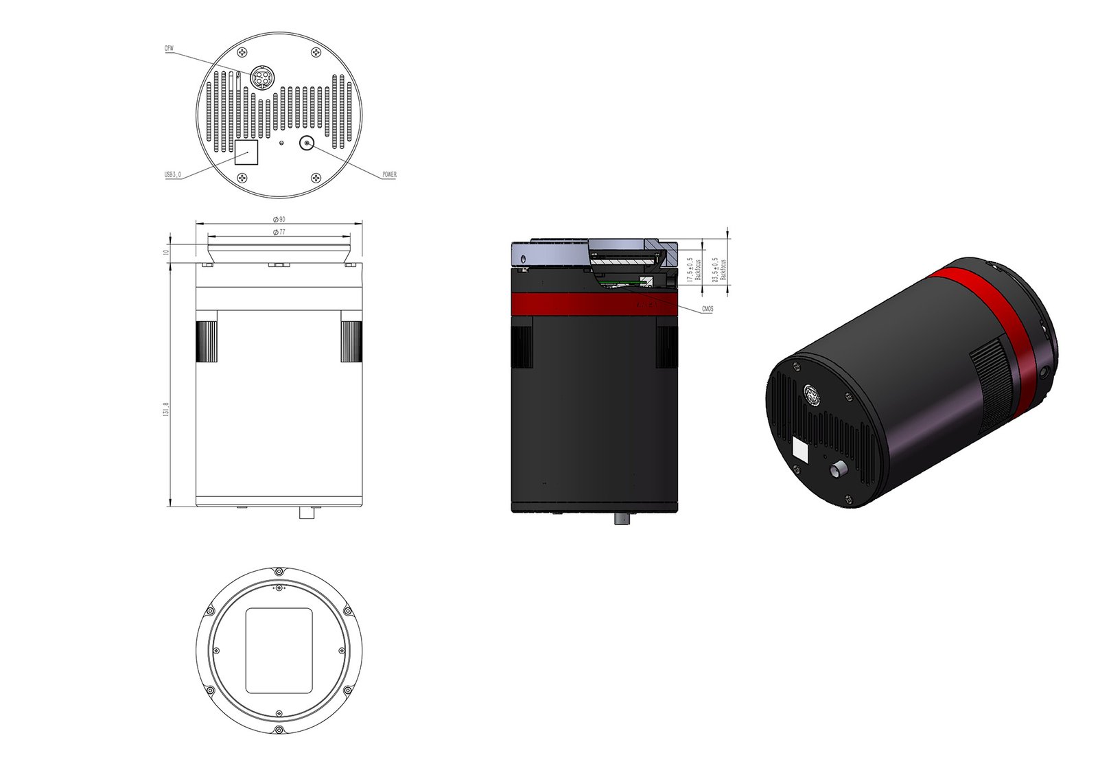 Apart from being available in colour and monochrome, the QHY600 series of astrophotographic cameras is available as standard back focus and short back focus versions.The standard back focus models have a camera angle adjuster (CAA) which attaches to radial dovetail at the front of the camera. The short back focus model only has the six-hole bolt pattern for attaching the camera to the filter wheel. Compare the mechanical drawings and assembly guide to decide which model you need.