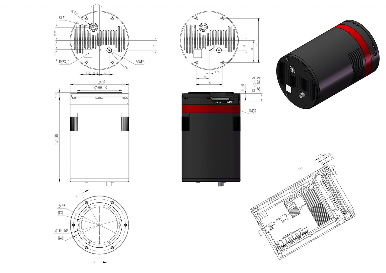 SBFL (Short back-focal length version) models are specially designed for DSLR lens users or those who specially require a short back focal length. This version has a special front part which has 14.5mm B.F.L only. The B.F.L consumed equals 12.5mm when connecting QHYCFW.