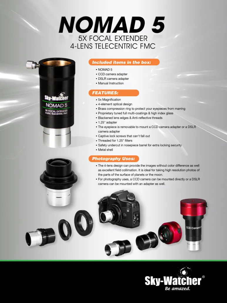 The Sky-Watcher 5x Barlow Lens is a high-quality optical accessory designed to enhance the performance of telescopes. It effectively multiplies the magnification of any eyepiece by five times, allowing for detailed observations of celestial objects. Constructed with premium glass elements and coatings, it ensures minimal light loss and maximum clarity. Ideal for both amateur and seasoned astronomers, this Barlow lens offers a significant boost in viewing power, making it a valuable addition to any stargazing toolkit. Its robust design and compatibility with a wide range of telescopes make it a versatile and durable choice for astronomy enthusiasts.