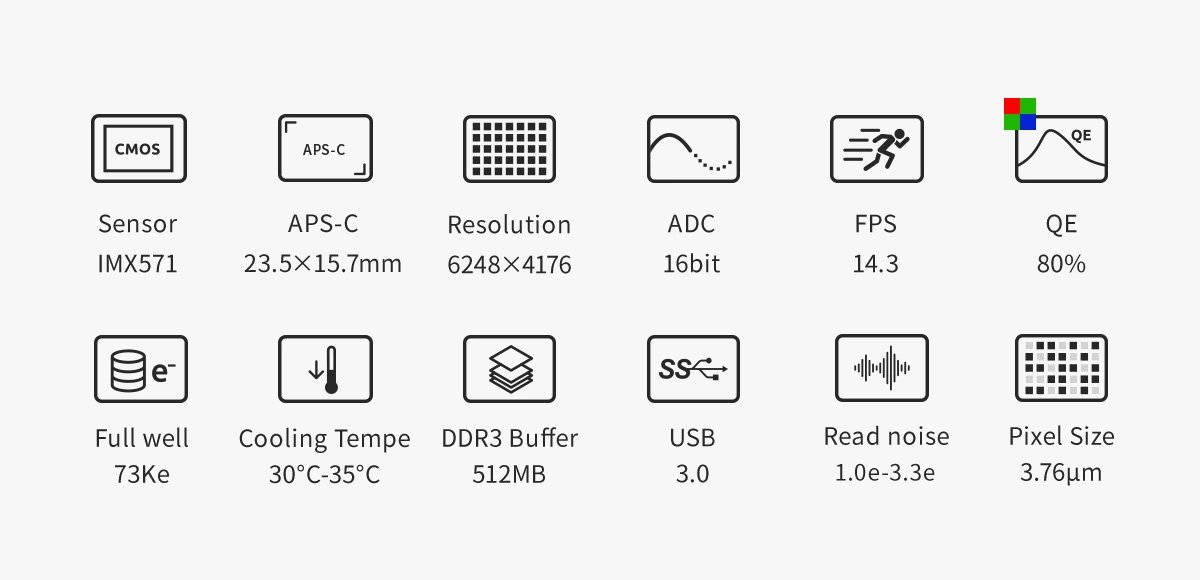 The ASI2600MM/MC Pro is equipped with the APS-C format Sony IMX571 sensor, measuring 23.5mm × 15.7mm with a 28.3mm diagonal. It delivers an outstanding resolution of 6248 × 4176 pixels, making it a true 26-megapixel powerhouse. Each 3.76 μm pixel offers an impressive full-well capacity of 73ke⁻, ensuring exceptional dynamic range and image quality.