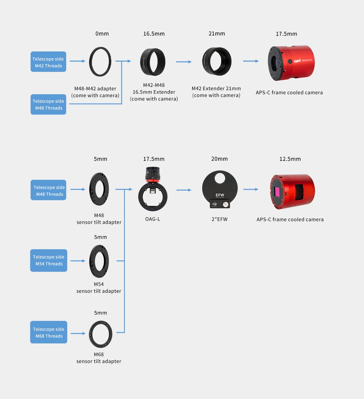 The camera incorporates a tilt plate with three sets of adjustment screws. In combination with the three mounting screws, they enable precise fine-tuning of the sensor plane for accurate alignment with the telescope’s optical axis, ensuring a flat imaging field and consistent star shapes across the entire frame.