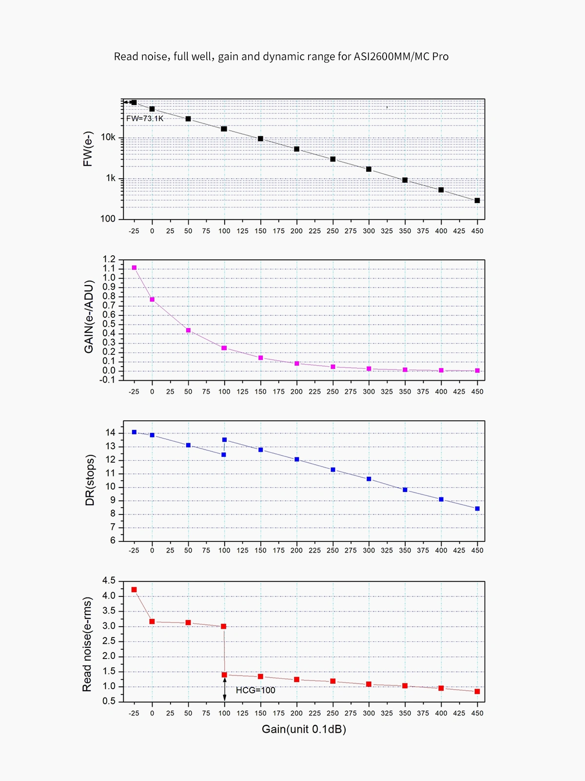 The ASI2600MM-P25 achieves a dynamic range of up to 14 stops. When the gain setting reaches 100, the HCG (High Conversion Gain) mode is automatically enabled, which substantially reduces readout noise while preserving dynamic range. For optimal deep-sky imaging performance, a gain setting of 0 or 100 is recommended.