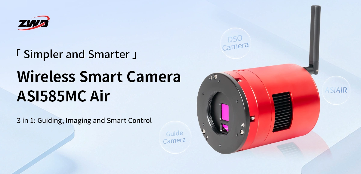 The ASI585MC Air is ZWO’s latest ultra-sensitive smart camera, combining a deep-sky imaging sensor, built-in guiding, and an integrated control system. This all-in-one wireless design makes it easier than ever to capture breathtaking astrophotography.