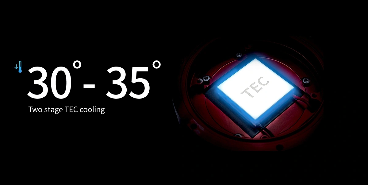 A dual-stage TEC cooling system drops the sensor temperature by 30–35°C below ambient. This deep cooling minimises dark current and sensor noise, keeping your long-exposure images crisp and clean even on warm nights.
