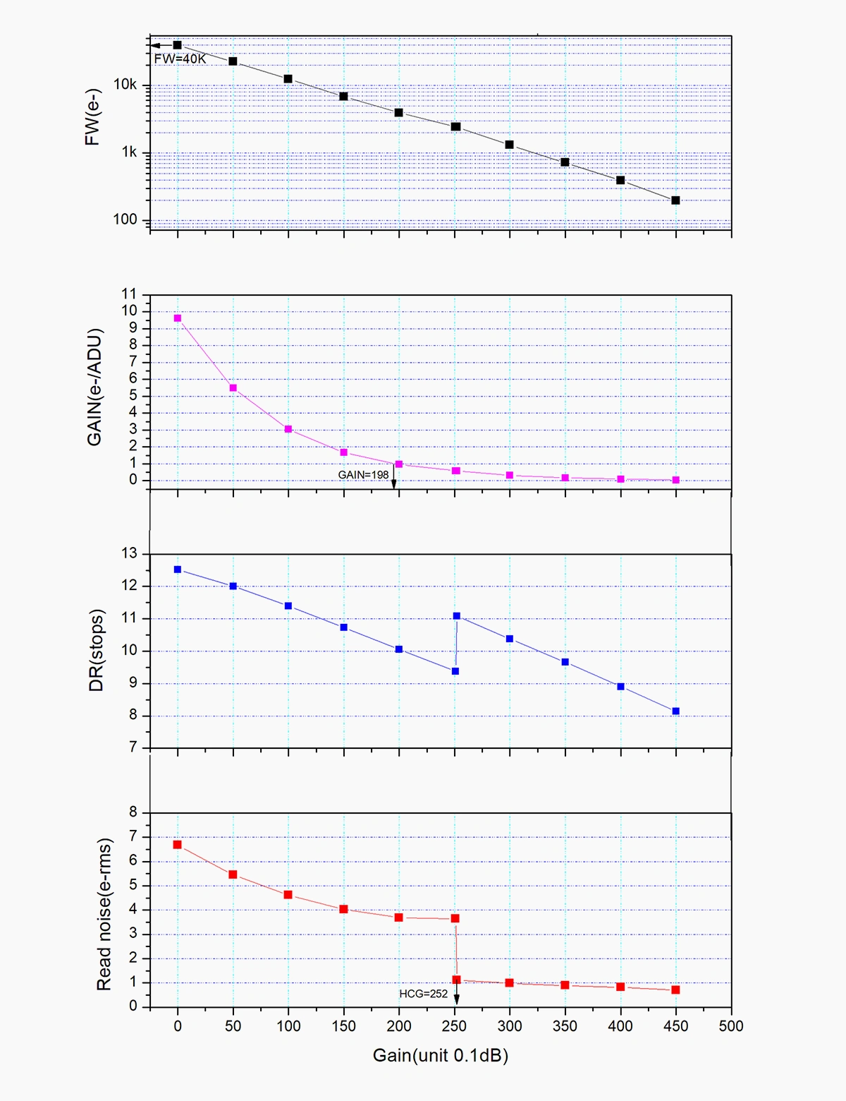 At high gain, the built-in HCG mode kicks in automatically to reduce read noise without sacrificing dynamic range. At gain 252, the ASI585 achieves a near 12-bit dynamic range with read noise as low as 0.7e — excellent for capturing both faint details and highlights.