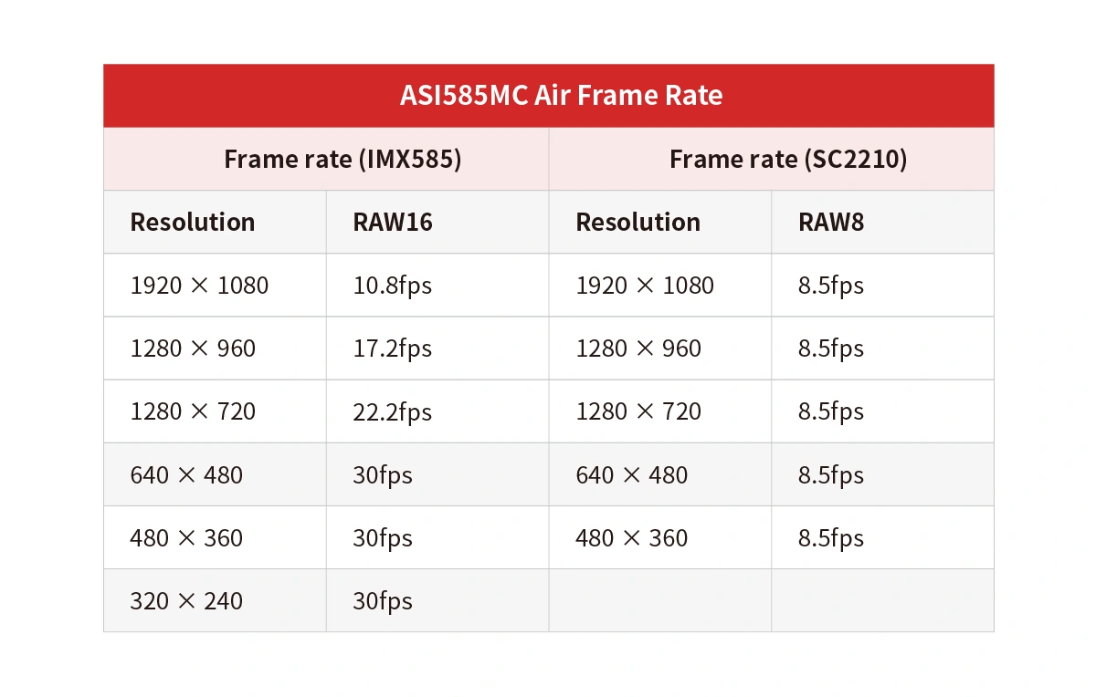 ZWO testing reports a peak QE of 91% for the ASI585MC Air, allowing more light to reach the sensor for better sensitivity and cleaner images.