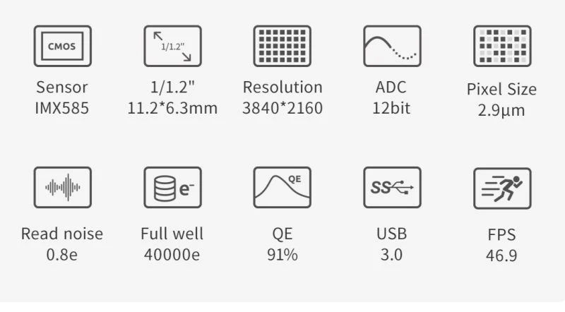 Sensor: Sony IMX585 Monochrome CMOS (1/1.2” format)