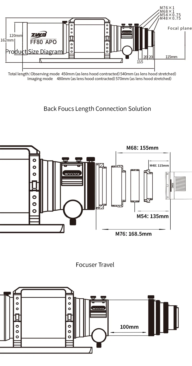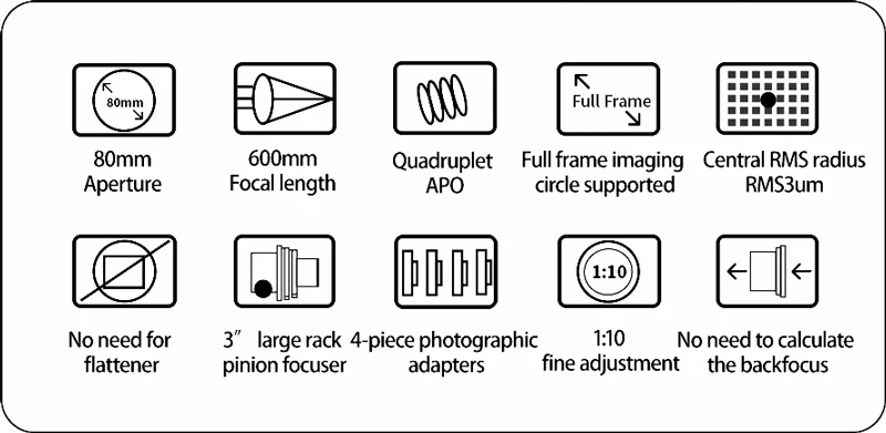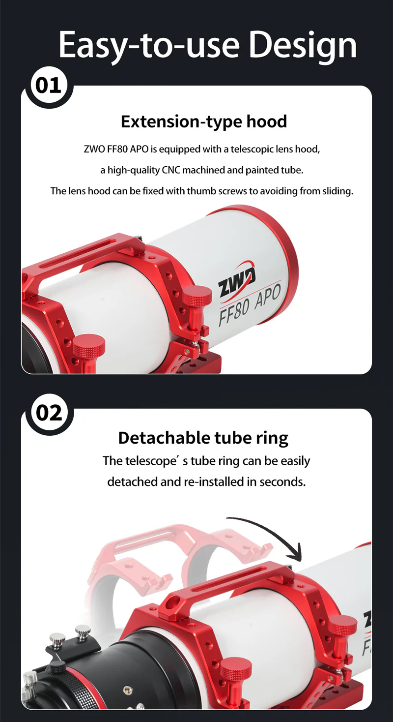 Unlike typical ED refractors that require precise backfocus spacing, the FF80’s fixed Petzval design removes the need to calculate sensor distance. You can connect filter wheels, off-axis guiders, and other imaging accessories without worrying about backfocus errors.