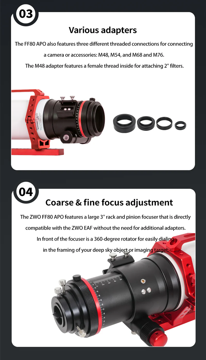 With its fast f/7.5 focal ratio and generous image circle, the FF80 is ideal for advanced deep-sky imaging. The large 3″ rack-and-pinion focuser provides smooth and stable control with 10:1 microfocus for critical adjustments. It rotates 360°, letting you frame your target exactly how you want. The focuser also natively supports the ZWO EAF without requiring adapters.
