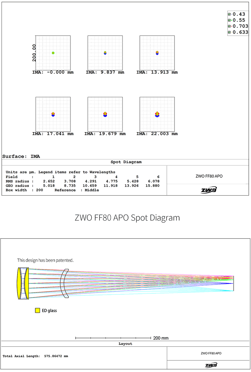 The ZWO FF80 is a premium apochromatic Petzval astrograph designed for full-frame astrophotography. With a focal ratio of f/7.5 and a 44mm image circle, this flatfield quadruplet delivers sharp, colour-accurate images across the entire frame. Two Extra-Low Dispersion (ED) glass elements minimise chromatic aberration, resulting in pinpoint stars and high contrast – even with large sensors like the ASI6200. Central RMS radius is an impressively tight 3 microns.