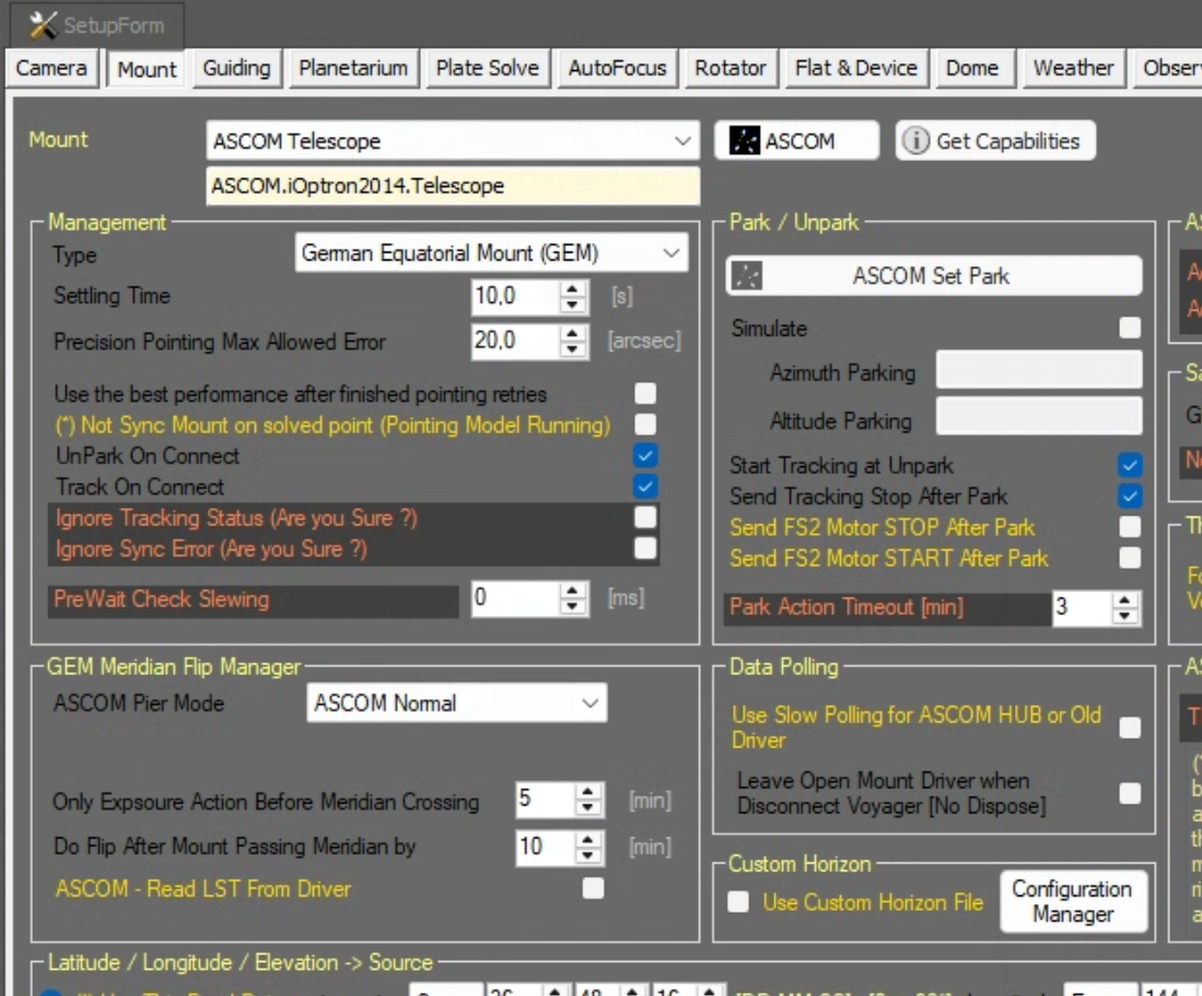 Here we see that the observatory control program is connected directly to the mount driver. Specifically for Voyager, in Voyager’s Mount setup page, you select an ASCOM Telescope as the mount, and in the chooser, you select the ASCOM driver for your specific mount (in this case, ASCOM.iOptron2014.Telescope – this particular dome has a slightly older CEM60 as a mount). If you’re using some other dome automation software like NINA, there will be a different-but-similar screen to set it up this way.