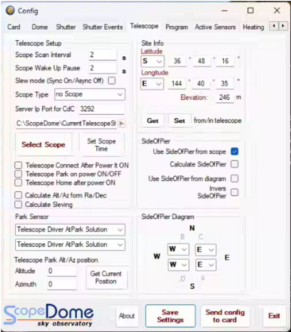 Important note: in this scenario, the dome control software is doing the slaving calculations. This means that in the ScopeDome driver, you must NOT have a telescope (remember that means “mount”) set up. That way the ScopeDome won’t be looking for instructions from any mounts. You can see this in the screenshot below where it says “no Scope” under “Scope Type”.
