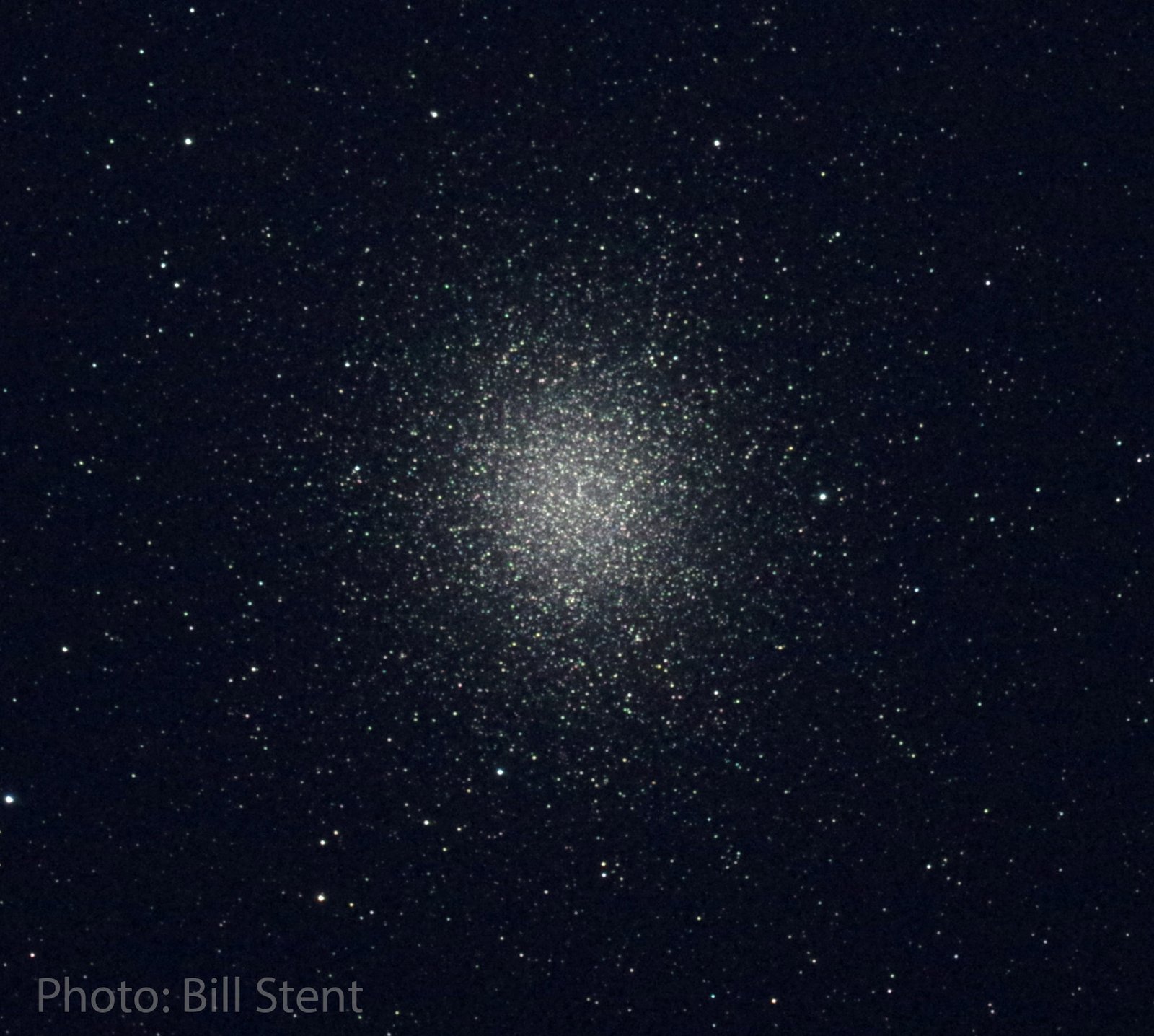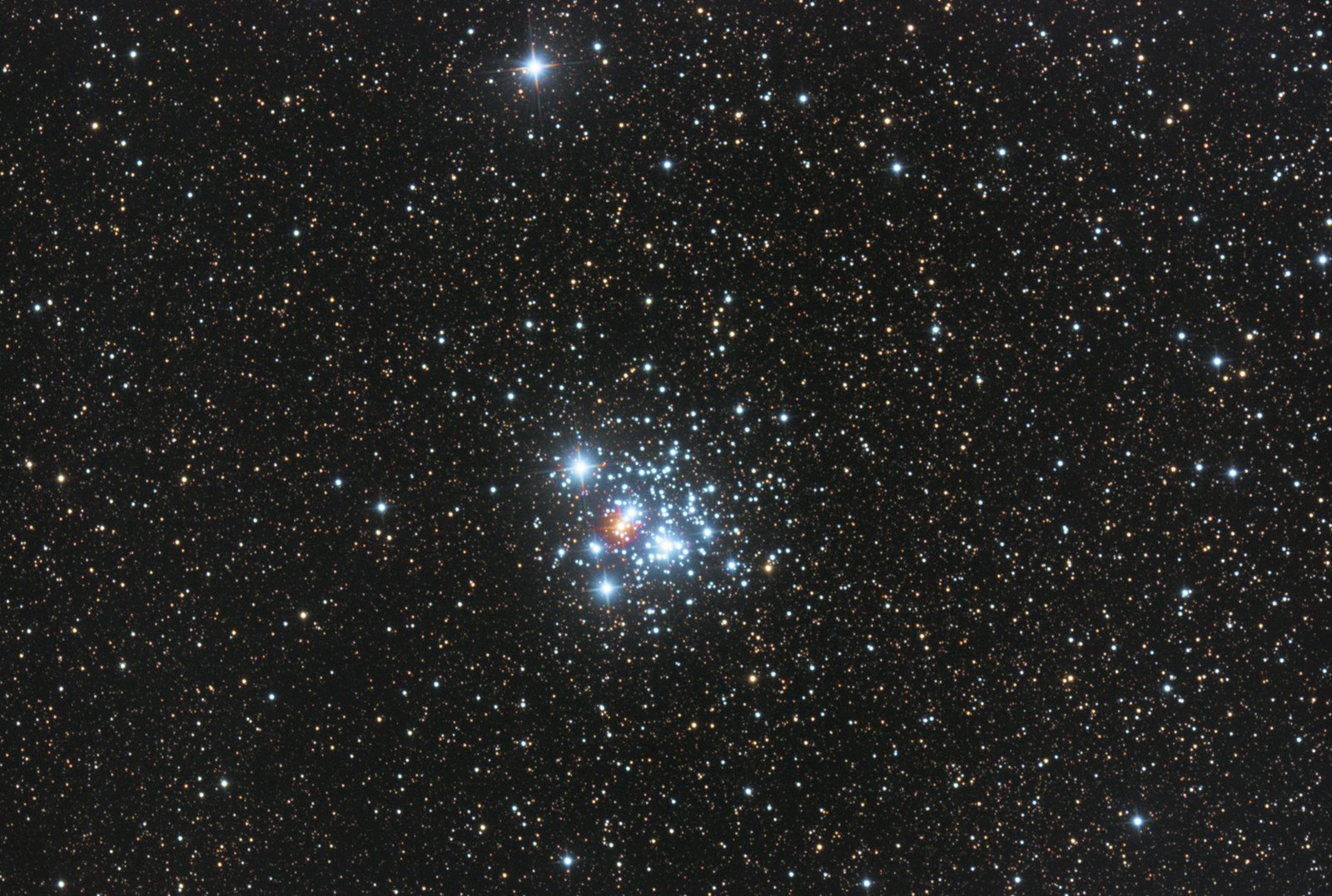 This example is the Jewel Box, NGC 4755, which is just outside the Southern Cross. This is the favourite of a lot of astronomers, as it’s very pretty and colourful. Most of the stars are blue, but there’s a prominent orange star in the middle.